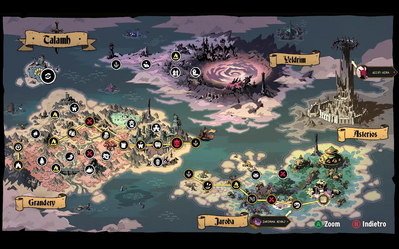 L’anima roguelike si manifesta attraverso un profondo sistema di progressione a doppio binario: da una parte gli upgrade permanenti acquistabili nell’hub principale tramite i cristalli raccolti durante le run, dall’altra gli artefatti temporanei che modificano radicalmente il nostro parco abilità per tutta la durata della sessione corrente.