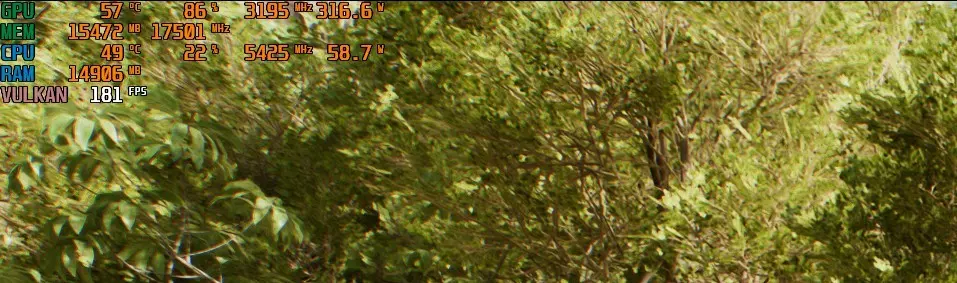 Proprio per merito di queste aggiunte la RTX 5080 riesce a girare senza problemi di sorta tutti i titoli in path-tracing testati mantenendo un framerate spesso superiore ai 100FPS (in risoluzione 2k). Proprio come la sua antenata 4080, la 5080 non ha realmente bisogno del downsampling AI per poter girare qualsiasi titolo a dettagli massimi in assenza di grossi malus prestazionali come l’illuminazione in path tracing, lasciando ampio margine di prestazioni per il download di eventuali mod grafiche o l’utilizzo di tecniche di antialising come il DLAA.
