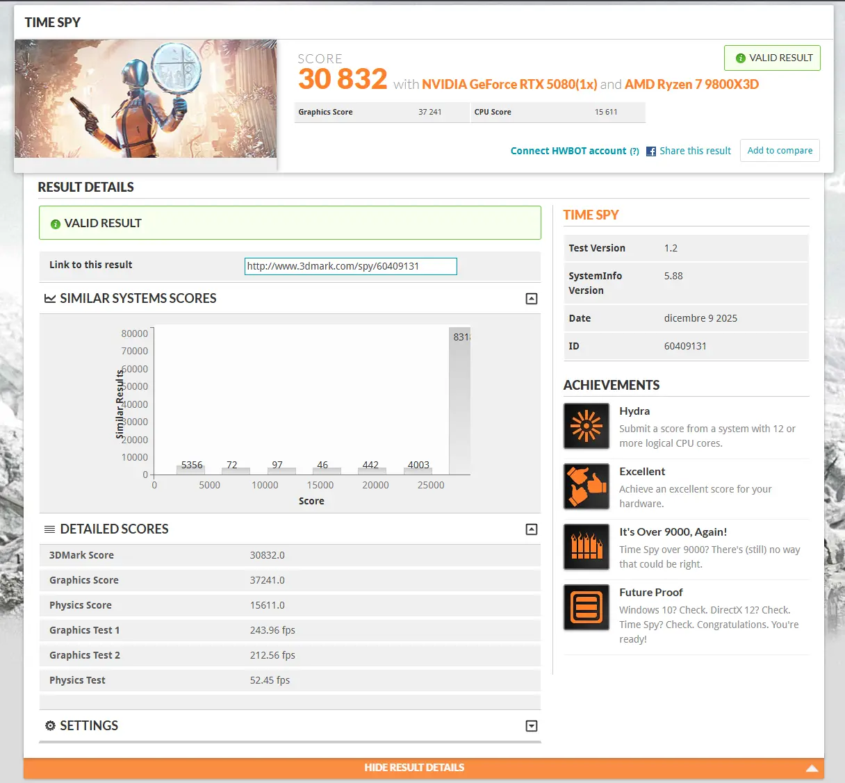 L’average graphics score di una RTX 4090 in Time Spy è di 30492 punti, score che la 5080 Aorus riesce a raggiungere e superare con relativa scioltezza una volta applicato un overclock giornaliero stabile su memorie e core. Durante i test la 5080 è arrivata a consumare fino a 420w e a toccare temperature non superiori ai 77 gradi (con temperatura ambiente di 23 gradi), condizione difficilmente replicabile durante i test in-game anche con l’utilizzo di path-tracing.