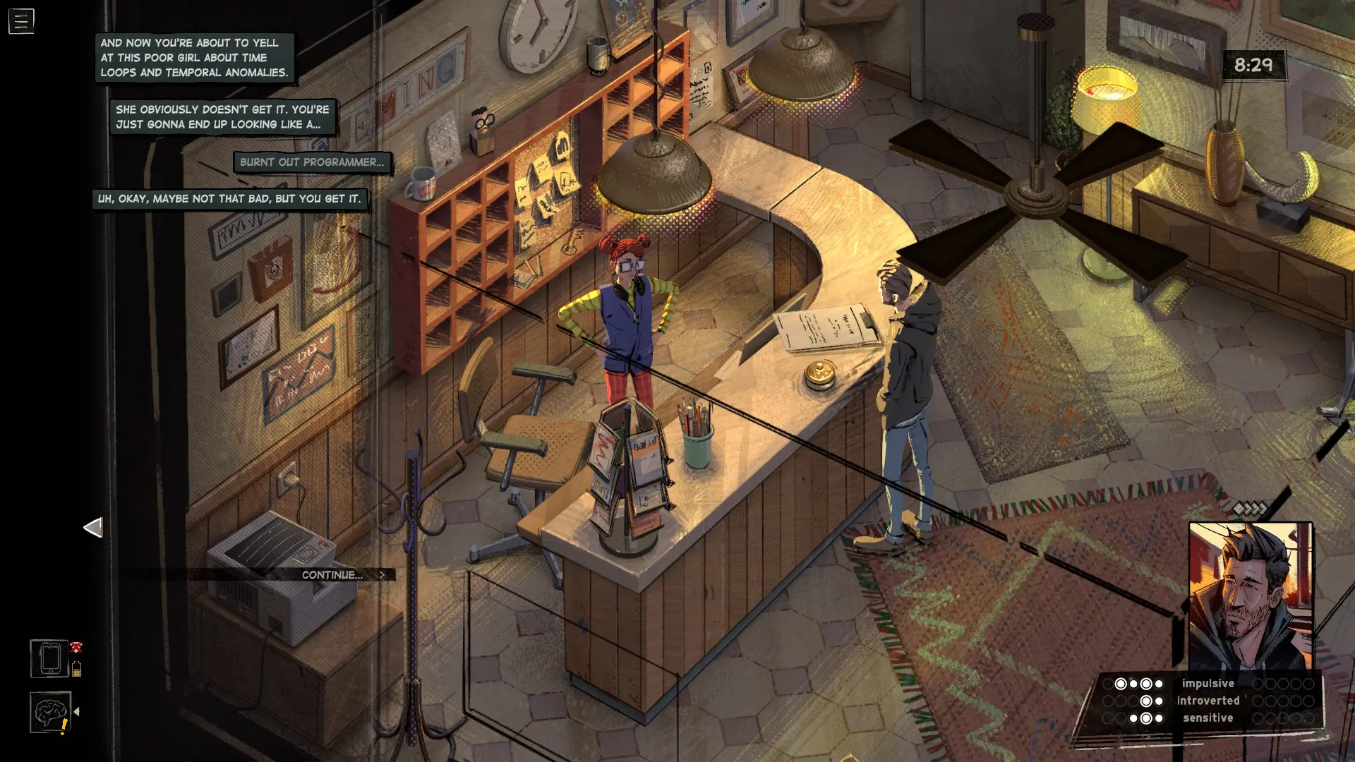 Dopo qualche ciclo di ripetizione, ci renderemo conto di essere intrappolati in un loop di 48 minuti senza apparente via d’uscita, e da qui inizieremo a esplorare più a fondo ciò che ci circonda alla ricerca non solo di un modo per spezzare il ciclo temporale, ma anche per uscire dal nostro stato depressivo.