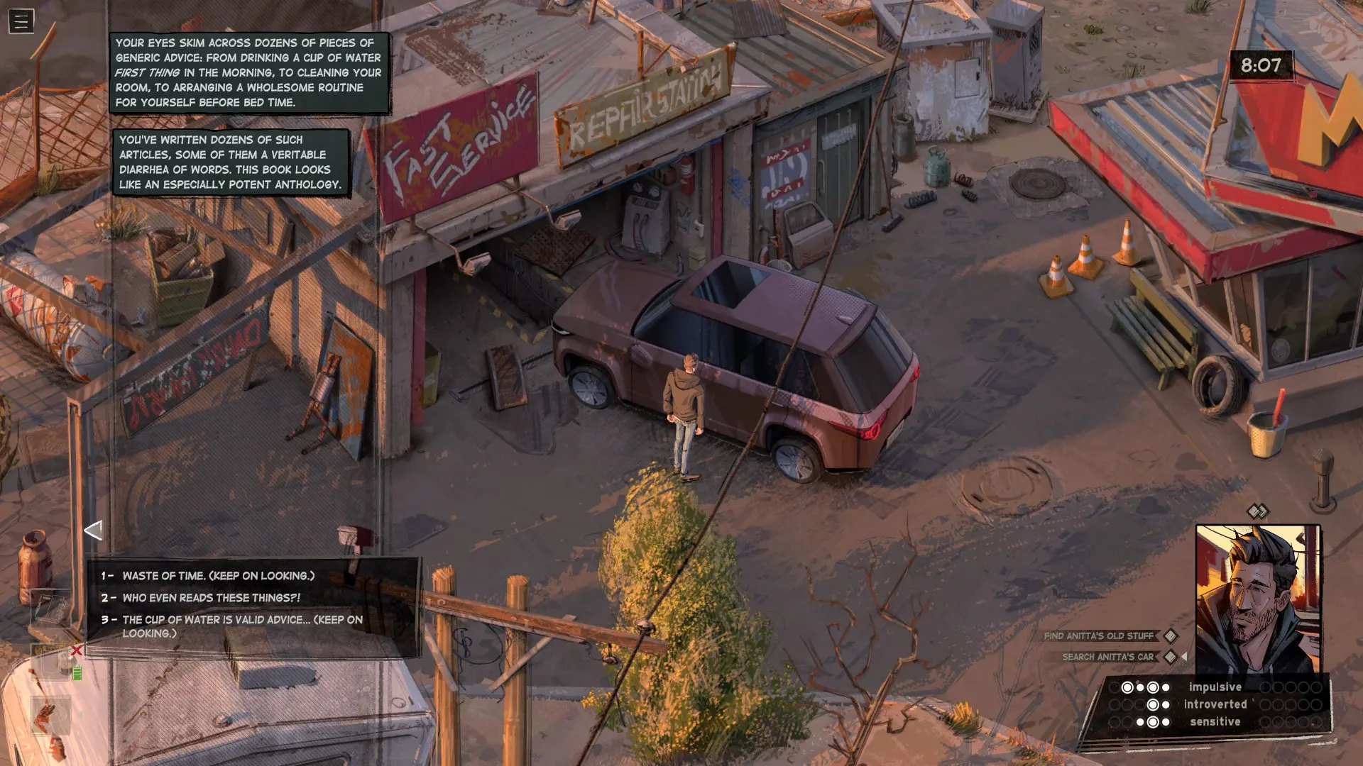 Per proseguire nel gioco, oltre a esplorare i dintorni del motel nel quale alloggiamo, dovremo avere forza di volontà. Questa è resa sotto forma di punti che potremo spendere nella ricerca di specifici obiettivi e, avviando tali obiettivi, potremo iniziare l’effettiva “quest”. Il sistema è studiato per fornirci tutte le informazioni necessarie a portata di mano e per farci concentrare su una o al massimo due missioni alla volta, evitando così confusione nel gameplay.